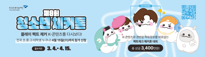 올해 체커톤의 표어는 ‘플레이 팩트 체커: K-콘텐츠를 다시 보다’인데요, K-POP, 드라마, 웹툰, 게임, e스포츠 등 우리 주변의 다양한 K-콘텐츠와 관련된 허위조작 정보를 직접 확인하고