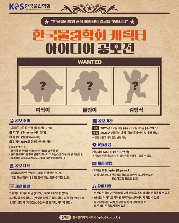 한국물리학회는 물리학 및 학회 활동에 대한 국민적 관심과 친밀도를 높이기 위해 공식 캐릭터를 제작하고자 합니다.
