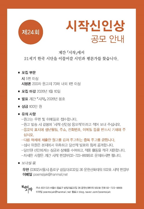 - 원고 발송 시 겉봉에 ‘시작 신인상 응모작’이라고 적어 보내 주십시오.