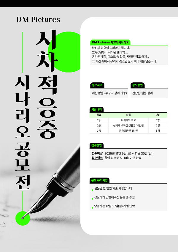 본 공모전은 단순한 아이디어 접수를 넘어 실제 제작으로 이어질 수 있는 기회를 제공하며, 우수작은 제작 검토 대상이 됩니다. 심사 과정에서 선정된 참가자를 대상으로 인터뷰가 진행될 수 있으며, 작품 의도와 구체적인 구성에 대해 논의합니다. 온라인 수업, 마스크 착용, 사회적 거리두기 등 급격히 변화한 사회 속에서 겪은 개인의 진솔한 이야기, 현실에 뿌리를 둔 공감 가능한 일상의 순간들을 자유롭게 표현해주시기 바랍니다.