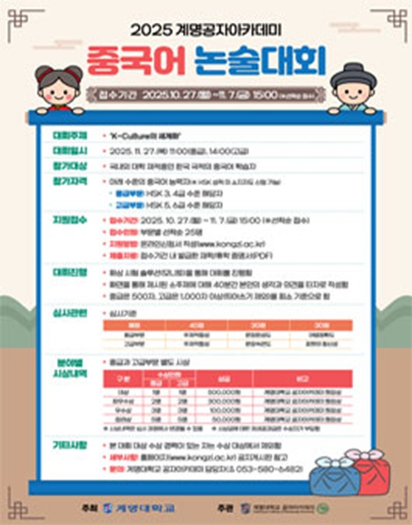 - 문의: 계명대학교 공자아카데미 담당자(☎ 053-580-6482)