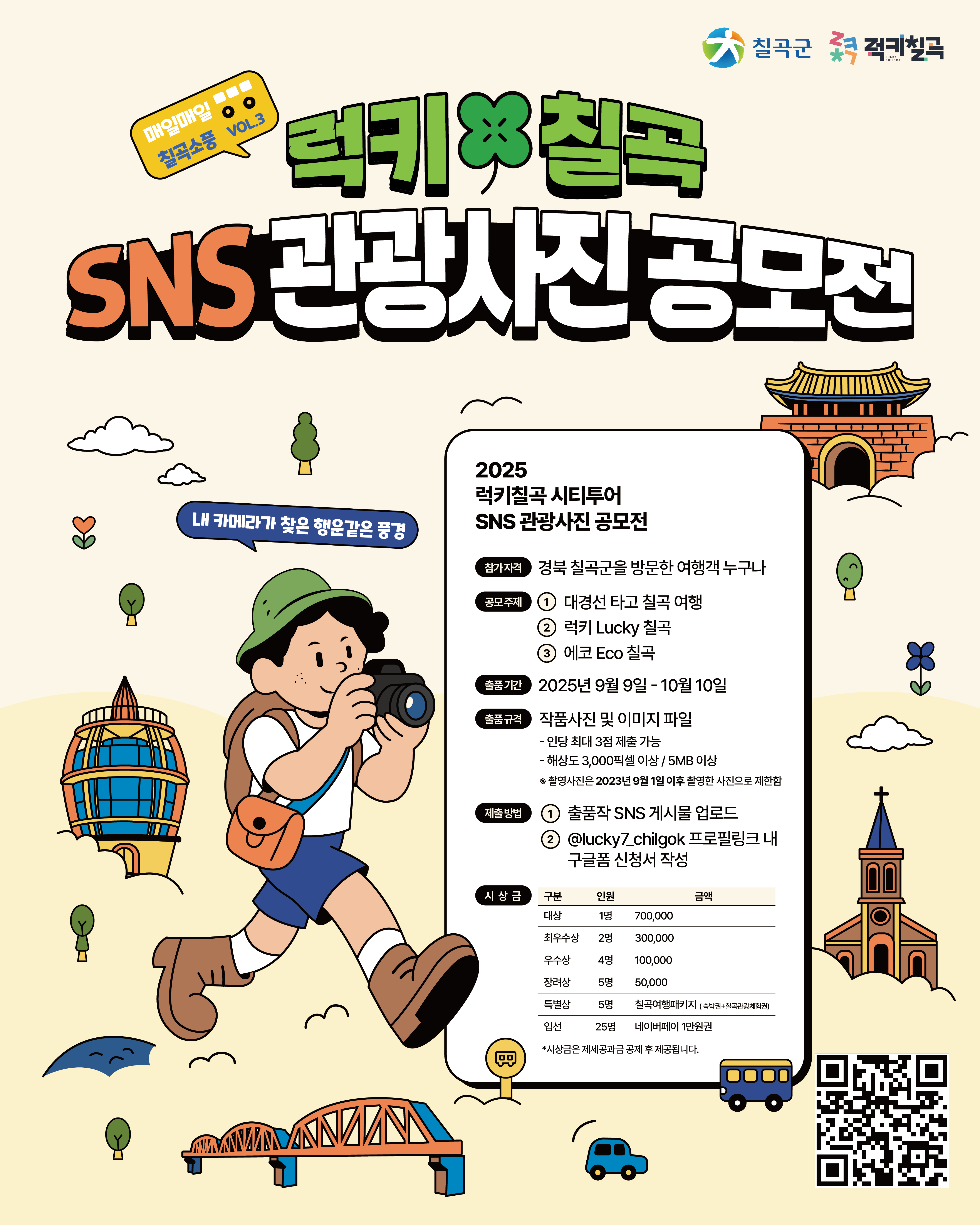 럭키칠곡 SNS관광사진 공모전● 참가 자격 - 접수기간 : 2025. 9. 9.(화) ~ 10. 10.(금)
