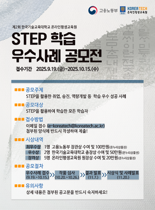 - 응모한 수기 또는 에세이의 내용은 STEP 활용 확산 및 사례 전파를 위하여 사례집 발간, 홈페이지, SNS, 보도자료 배포 등의 홍보에 활용할 수 있습니다.