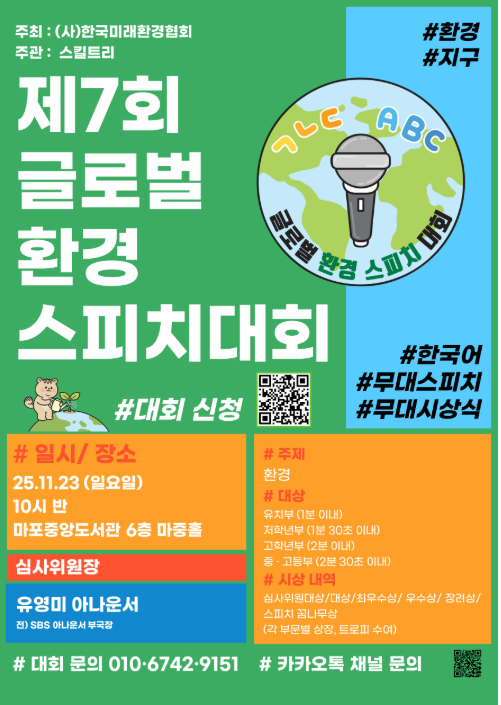 - 010-6742-9151 또는 카카오톡 채널 @글로벌환경스피치대회