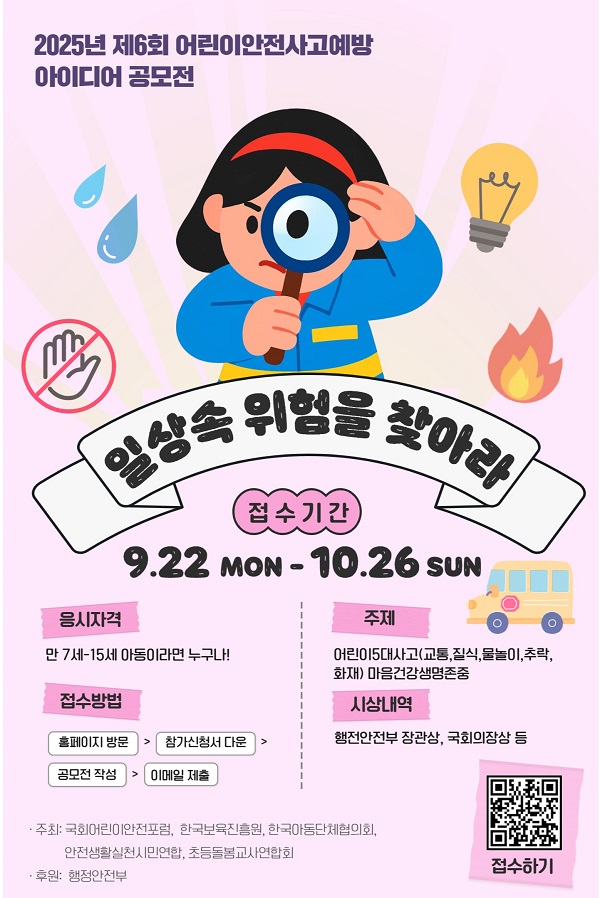 - 접수방법 : 한국아동단체협의회 홈페이지 ▶ 공지사항 ▶「제6회 아동 안전사고예방 아이디어 공모전」 서식 다운