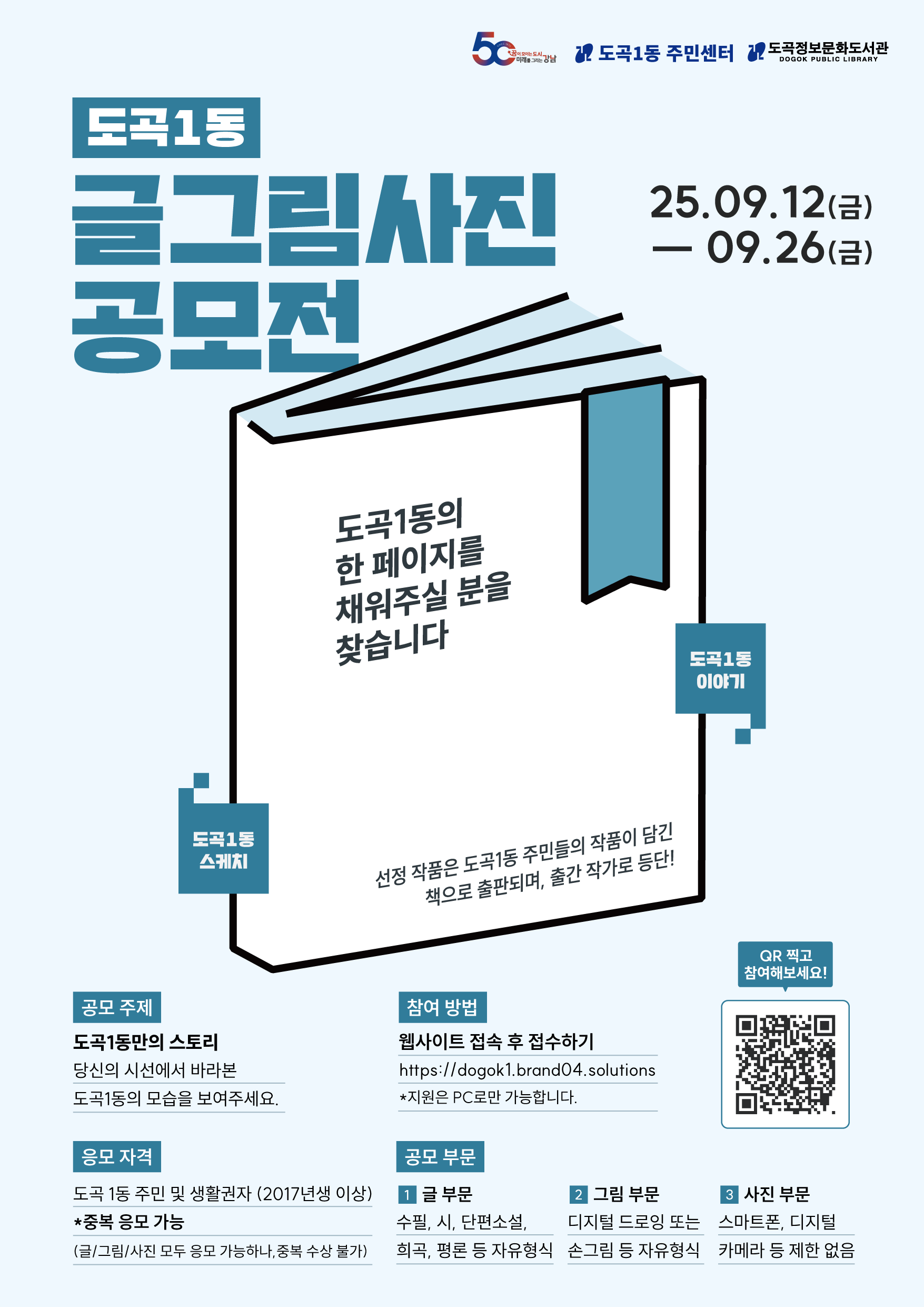 심사기간 9월 29일 ~ 10월 2일 선정기준: 심사위원 80%, 주민투표 20%심사결과 10월 15일 개별연락 및 게시 예정 선정 작품은 도곡1동 주민들의 글이 담긴 책으로 출판되며, 출간 작가로 등단할 수 있는 기회 제공 전시일정 10월 중 출판 기념회 12월 중 ● 시상 내역1등 100,000원 각 분야별 1명 (총 3명)2등 50,000 각 분야별 2명 (총 6명)3등 10,000 각 분야별 5명 (총15명)선정 작품은 도곡1동 주민들의 글이 담긴 책으로 출판되며, 출간 작가로 등단할 수 있는 기회 제공 전시일정 10월 중 출판 기념회 12월 중 ● 제출 형식참여방법 : 웹사이트 접속 후 접수하기 https://dogok1.brand04.solutions/ *지원은 pc로만 가능● 접수 방법참여방법 : 웹사이트 접속 후 접수하기 https://dogok1.brand04.solutions/ *지원은 pc로만 가능● 심사 기준선정기준: 심사위원 80%, 주민투표 20%● 유의 사항● 문의 사항