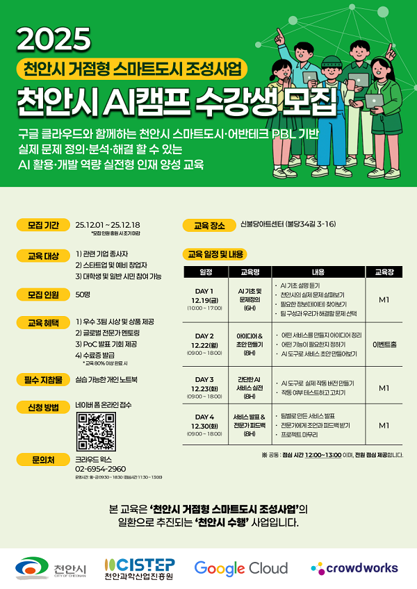 "본 교육은 천안시 거점형 스마트도시 조성사업의 일환으로 추진됩니다."