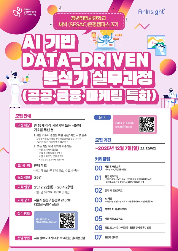 온라인강의 무료 제공 [새싹(SeSAC) 은평캠퍼스 3기] AI 기반 Data-Driven 분석가 실무과정 (공공 금융 마케팅 특화) 교육생 모집 (~12/7)