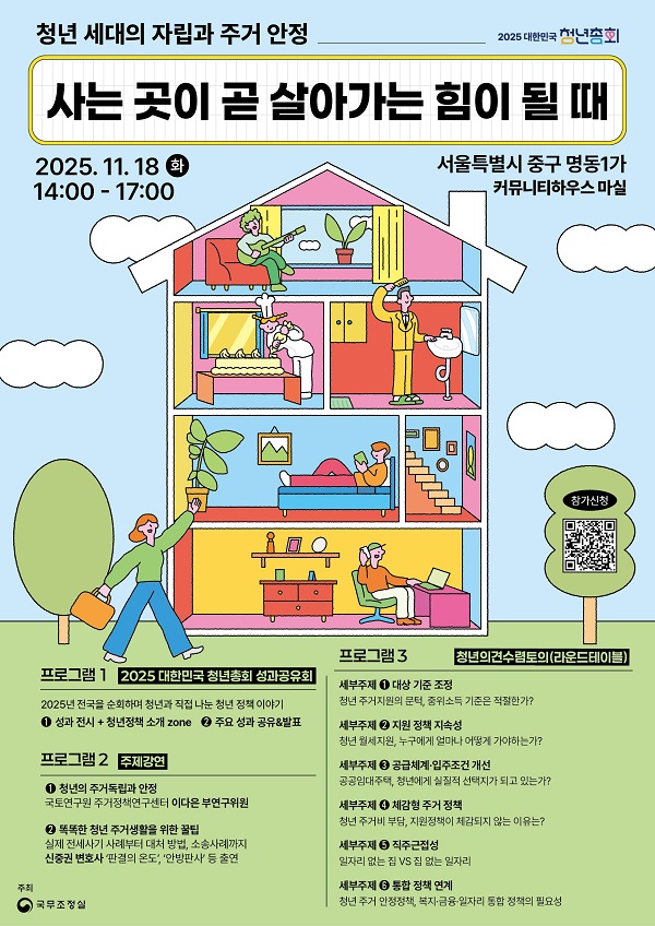 2025 대한민국 청년총회 - 사는 곳이 곧 살아가는 힘이 될 때● 참여 대상대한민국 청년(만19세~39세)● 프로그램 내용 사는 곳이 곧 살아가는 힘이 될 때청년의 자립, 그 출발점은 ‘주거 안정’ 아닐까요? 국무조정실 주관 <2025 대힌민국 청년총회>는 전국을 순회하며 청년의 목소리로 청년을 위한 정책을 논의하고 있습니다.이번 <5차 대한민국 청년총회 in 서울>에서는청년 주거 문제를 다양한 시선에서 이야기합니다. 프로그램 안내 올해 청년총회의 주요 논의와 성과를 공유하는 성과공유회 전문가와 함께 살펴보는 똑똑한 청년 주거 생활을 위한 꿀팁과 정책들 청년 당사자가 직접 목소리를 내는 라운드테이블 전세사기 예방과 청년에게 와닿을 수 있는 주거 정책을 위한 집중 토의까지—년의 눈으로, 청년의 언어로지금 우리의 ‘사는 곳’을 이야기합니다. 2025.11.18(화) 14:00~17:00 커뮤니티하우스 마실● 진행 일시11/18(화) 14:00-17:00● 진행 장소커뮤니티하우스 마실● 신청 기간~11/17(월) 23:59● 참여 혜택웰컴키트 및 케이터링 제공● 신청 방법참가 신청 : https://moaform.com/q/ILr6hy● 문의 사항010-5488-9776 유나래 연구원