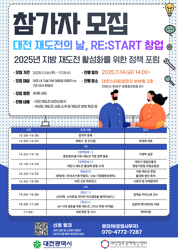 - 행사명: 대전 재도전의 날, RE;START - 2025년 지방 재도전 활성화를 위한 정책 포럼