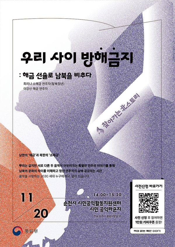 ※ 본 행사는 통일부 2025 찾아가는 북스토리 토크콘서트의 일환으로, 남북 청년이 다양한 주제로 서로의 삶을 연결하는 문화교류의 시간을 마련합니다. 이번 17회차에서는 해금과 소해금의 선율을 따라 음악과 이야기, 그리고 서로의 삶이 만나는 자리로 여러분을 초대합니다.