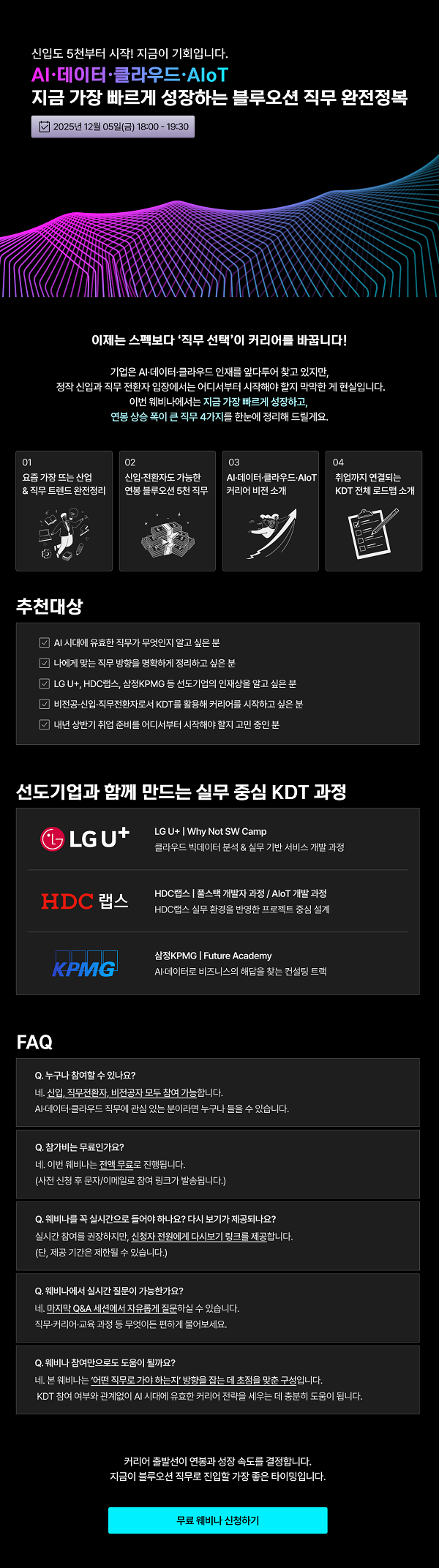 이번 웨비나를 통해 가장 빠르게 성장하는 블루오션 직무를 선점해 커리어 급성장을 경험하시기 바랍니다.