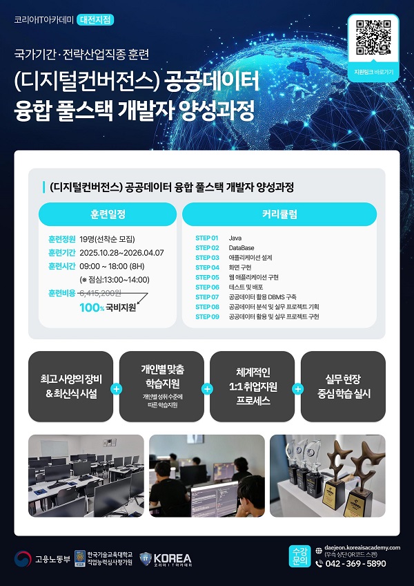 본 과정은 프론트엔드, 백엔드, 공공데이터 활용 능력을 고루 갖출 수 있도록 설계되어 차별화된 기술역량의 풀스택 개발자로 성장하실 수 있습니다.
