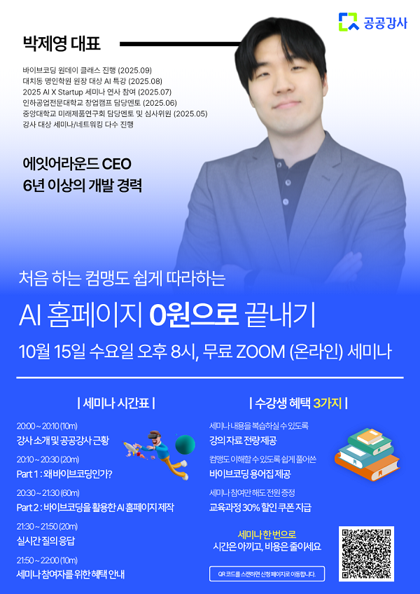 이번 세미나에서는 컴맹도 쉽게 따라하는, 0원으로 만드는 AI 홈페이지 실전 비법을 확인하실 수 있습니다.