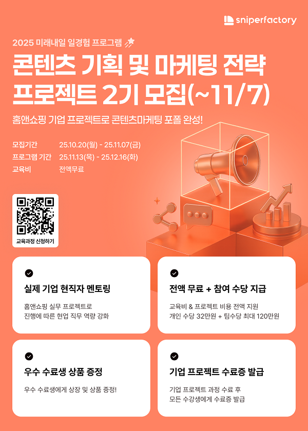 [스나이퍼팩토리x홈앤쇼핑] 콘텐츠 기획 및 마케팅 전략 프로젝트 과정 2기 모집📣