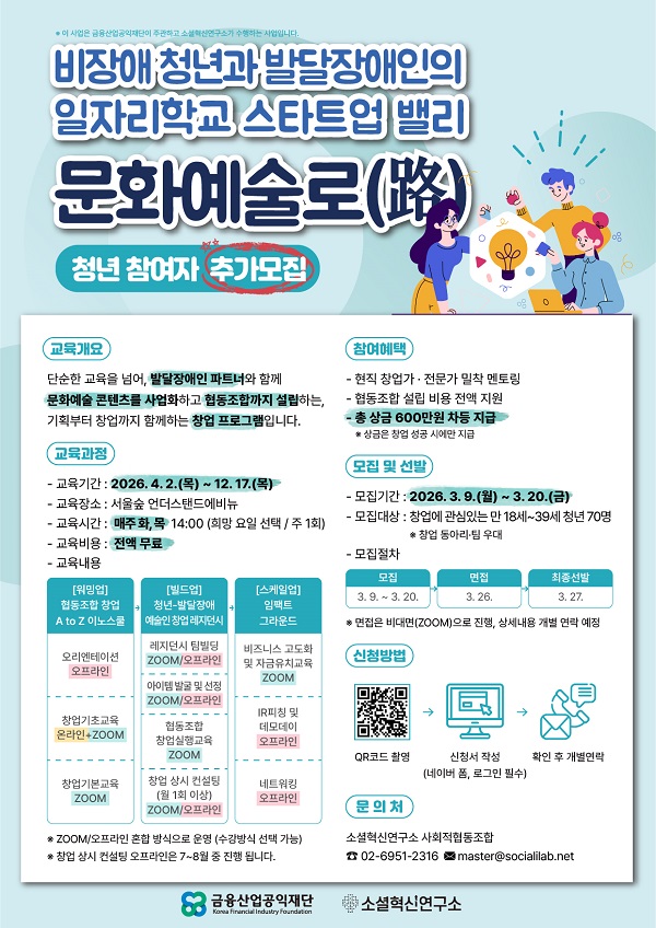 발달장애인 동료와 팀을 구성해 협동조합 설립을 목표로 하는 창업 과정으로, 문화예술 콘텐츠를 기반으로 지속가능한 사회적기업 모델을 함께 설계하고 실행해볼 청년 창업가를 모집합니다.