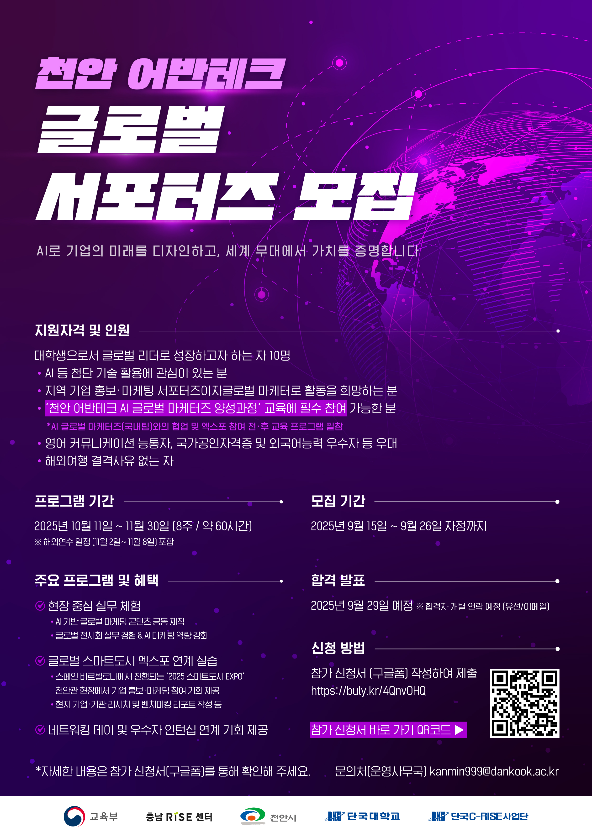 다양한 세대와 배경을 가진 인재들이 AI 기술을 활용하여 기업 맞춤형 글로벌 마케팅 전략을 수립하고, 콘텐츠 제작 역량을 함양할 수 있도록 『천안 어반테크 글로벌 서포터즈』를 모집하고자 함