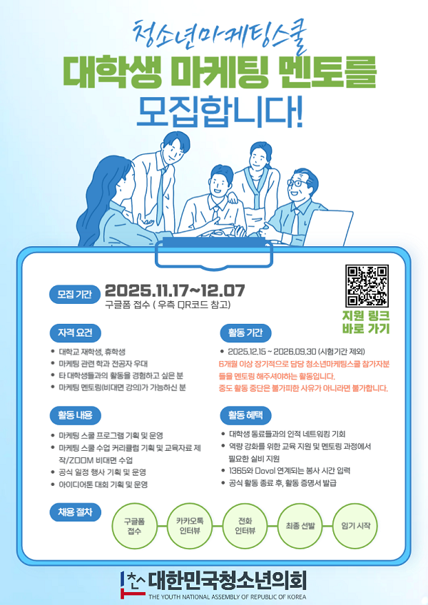 26년 3월부터 진행될(예정) 청소년 마케팅 스쿨 1기 대학생 멘토를 모집합니다.