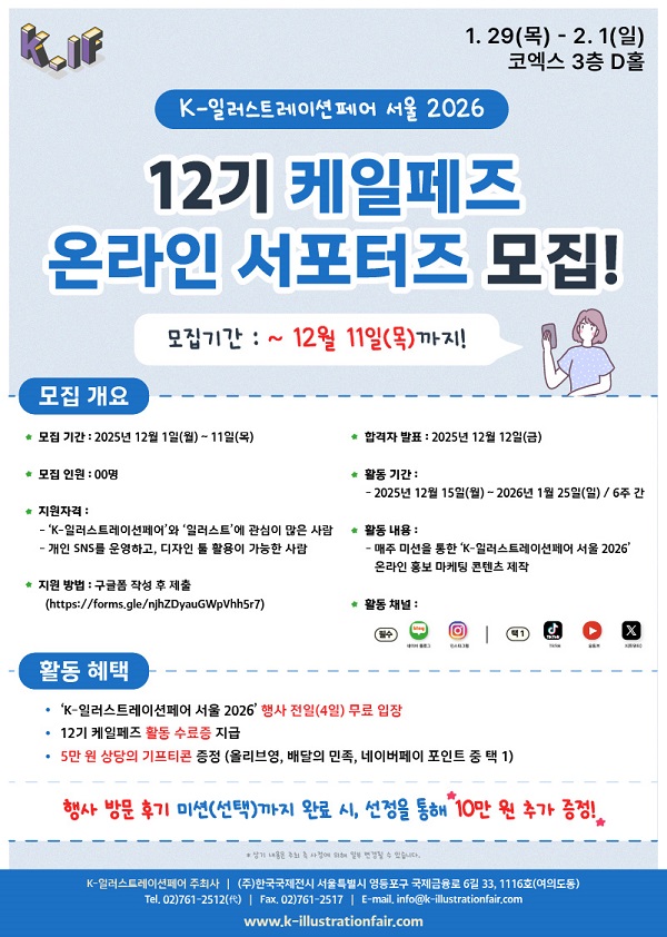 [K-일러스트레이션페어 서울 2026] 온라인 서포터즈 '12기 케일페즈' 모집 (~ 12/11(목)까지)