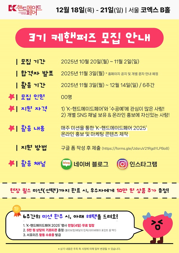 [K-핸드메이드페어 2025] 3기 케핸퍼즈 온라인 서포터즈 모집 (~11/2(일)까지)