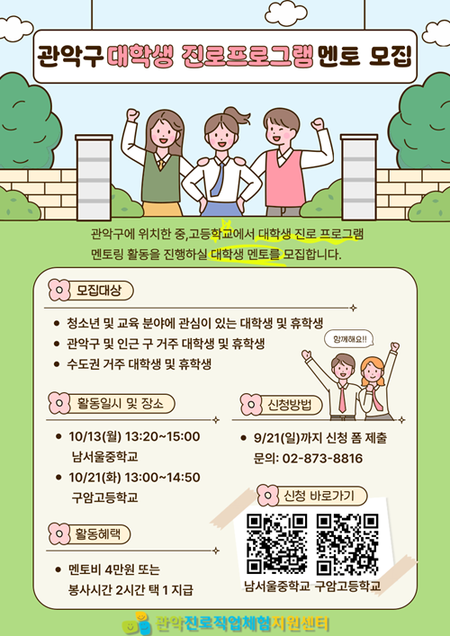 - 관악구에 위치한 중,고등학교에서 대학생 프로그램 진행할 대학생(휴학생)
