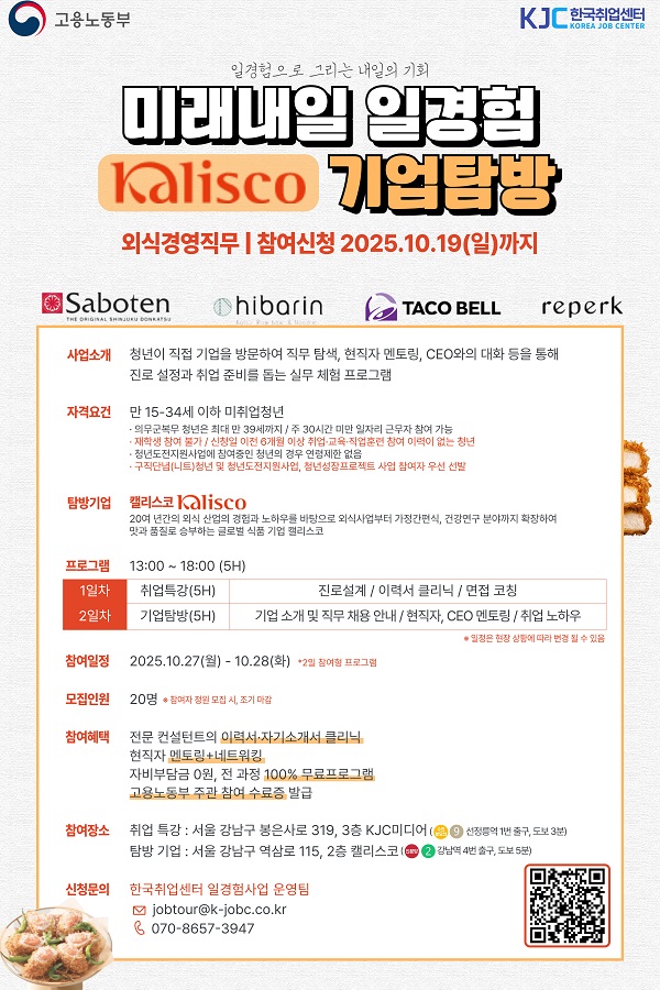 [고용노동부] 미래내일 일경험 캘리스코(kalisco) 기업탐방, 외식·경영 직무 참여 청년 모집