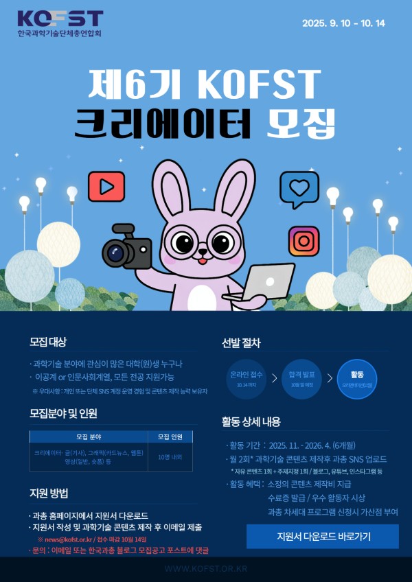 - 이메일 : news@kofst.or.kr 또는 한국과총 블로그 모집 안내 포스트에 댓글로 문의가능