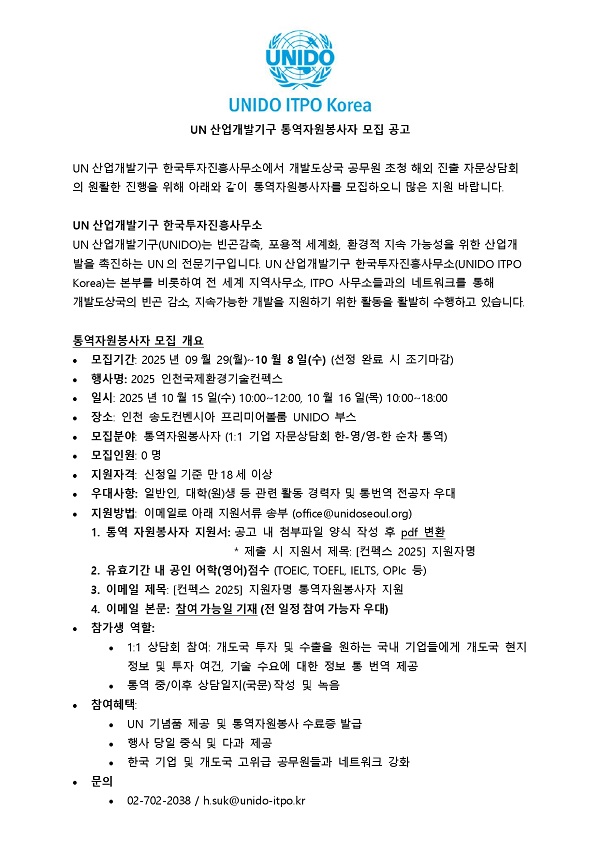 [UN산업개발기구] 2025 인천국제환경기술컨펙스 통역 자원봉사자 모집 공고