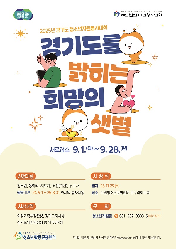 - 경기도청소년활동진흥센터 → 공지사항 → '2025년 경기도 청소년자원봉사대회 안내 및 모집' 게시글 확인